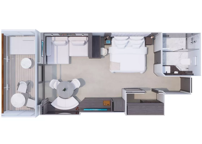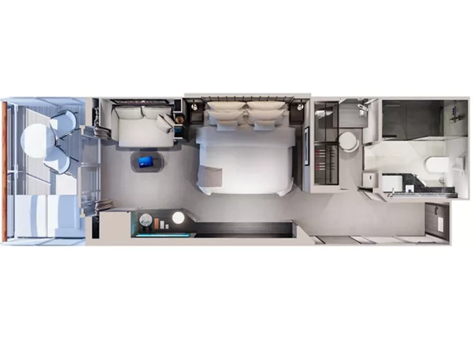 | Ocean Residence - Cove Residence Suita + terasa so sedením a lehátkami 56 m². Spálňa s obývacou a jedálenskou časťou, šatník. Koktailová súprava, minibar, kávovar, vodná kanvica, ďalekohľad, sejf, kúpeľňa so sprchou. Závesy, svetlo, klimatizácia ovládané smart technológiou. Taška Technogym Case Kit. Fľaša šampanského na privítanie. Maximálna kapacita 3 osoby. | 59 394 € 19 798 € za osobu |
